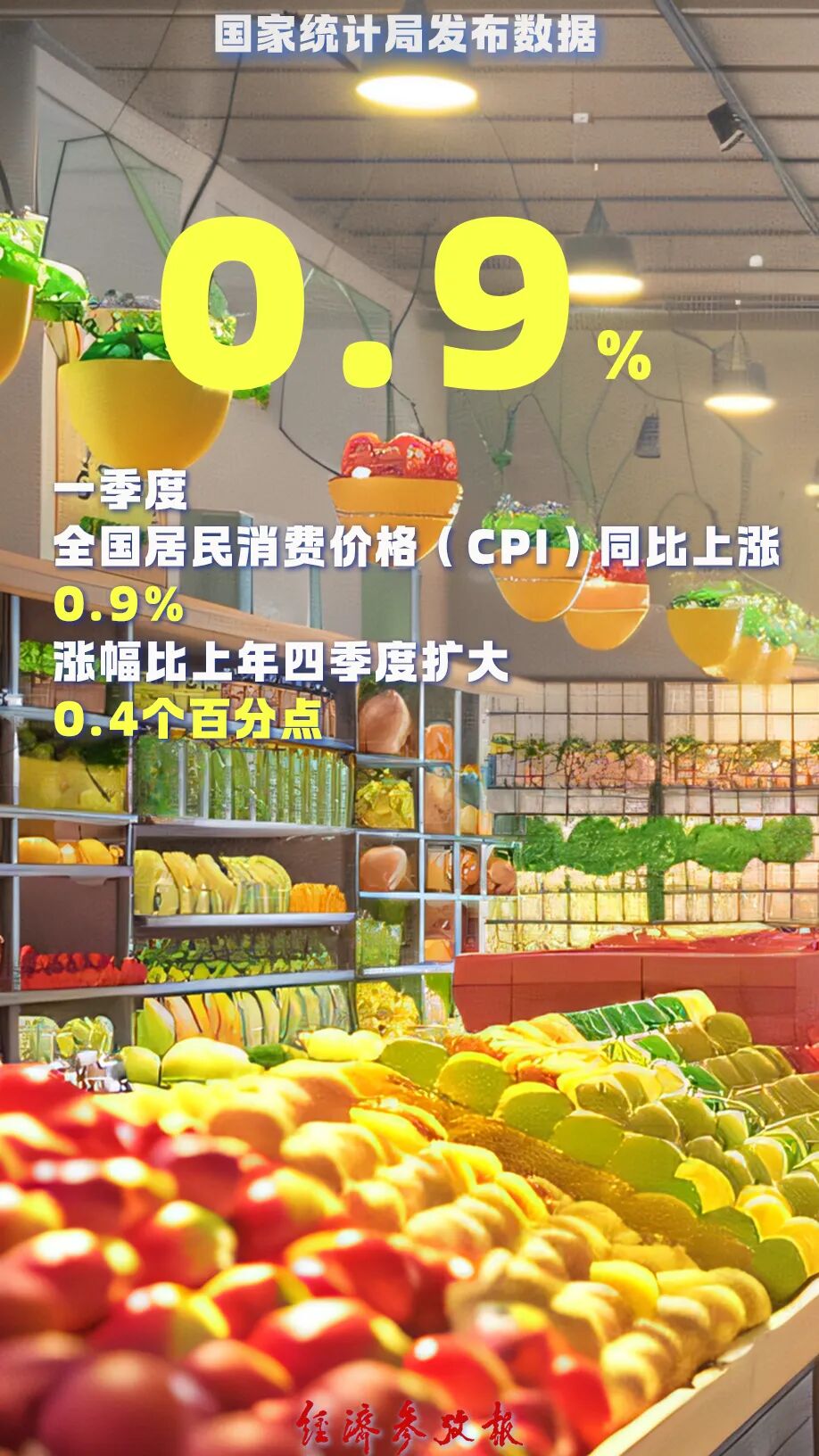 一季度,全国居民消费价格(CPI)同比上涨0.9%,涨幅比上年四季度扩大0.4个百分点。