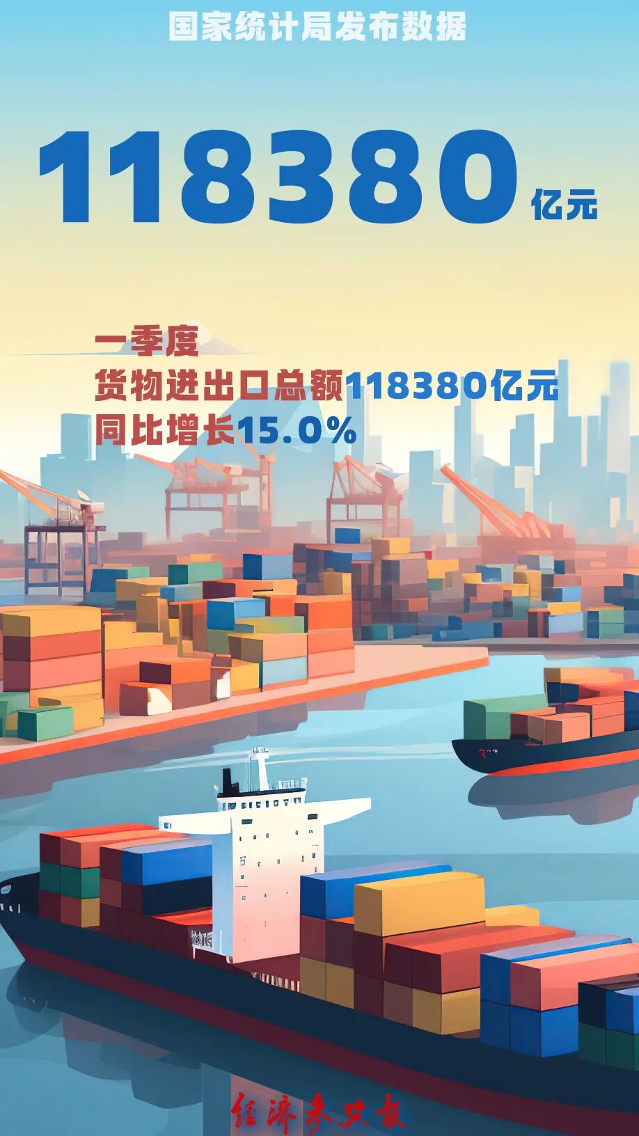 一季度,货物进出口总额118380亿元,同比增长15.0%。