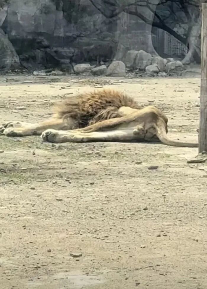 视频显示,园区内一雄性狮子躺在地上,狮子体型较瘦,能看到明显骨骼,视频坐标为本溪市动植物园。