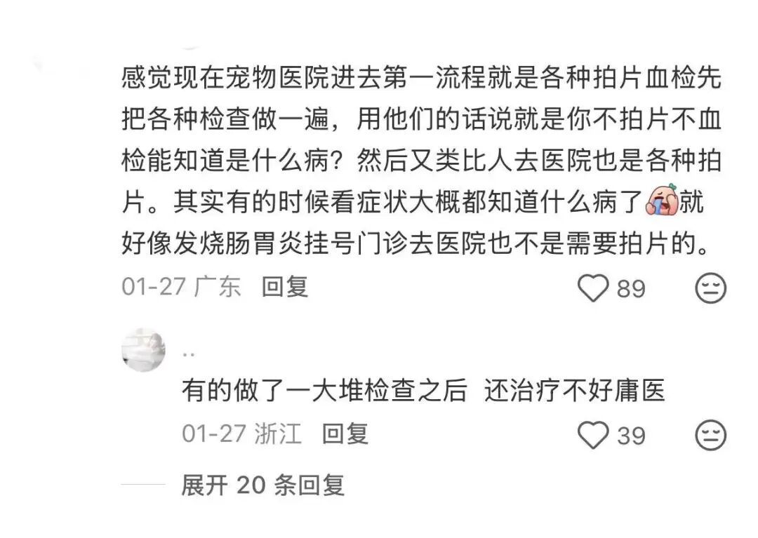 另一方面,也有不少宠物主人被宠物医院忽悠做了多余检查的情况。