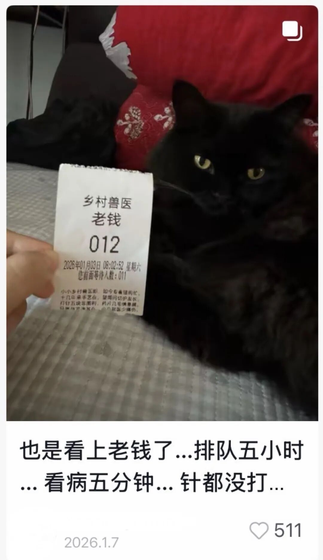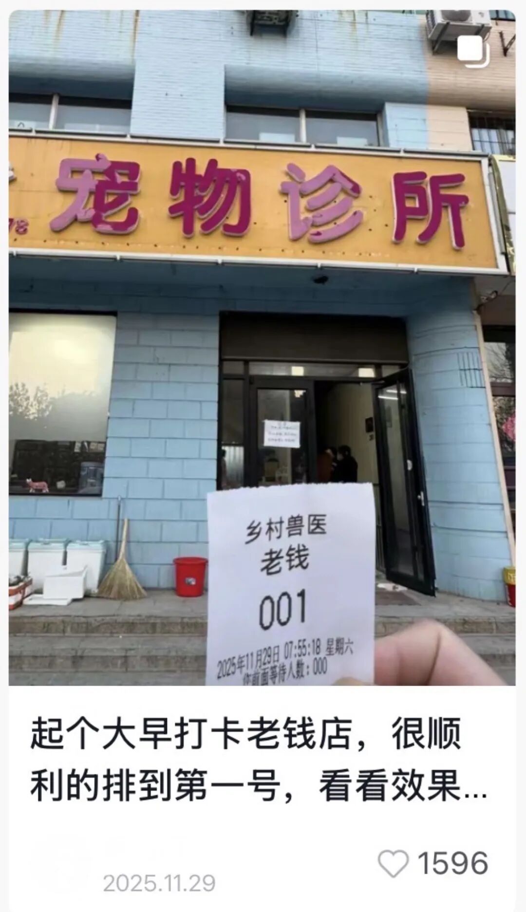 除了治疗效果好、价格公道,老钱诊所还有不少充满人情味的细节。@夏七顺还提到:“我们家狗体形大,怕吓到诊室其他小狗,老钱就直接去我们车上给它打的疫苗。就算车停得远了,他也过去了。”
